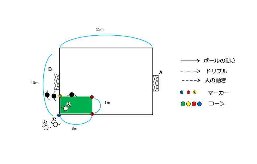 サイドでの1vs1の練習でカットインあるいは縦の突破でゴールを目指していきます。緑のグリッド内は相手ディフェンスが侵入できないので、プレスをかけられることなく駆け引きをすることができます。