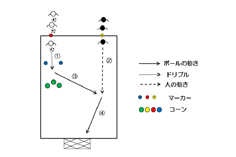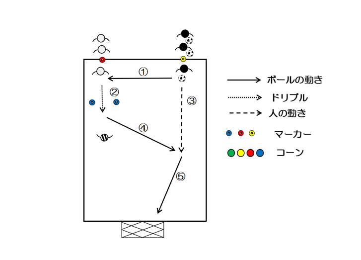 - 白が青マーカーを通過しコーンにぶつかる前に黒へパスを出す(③)